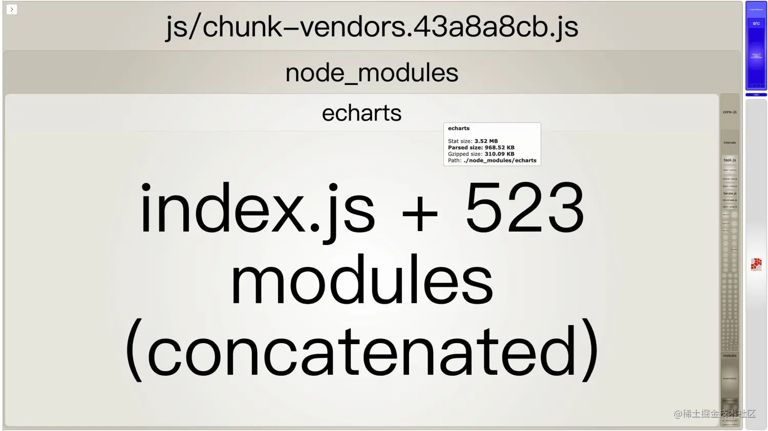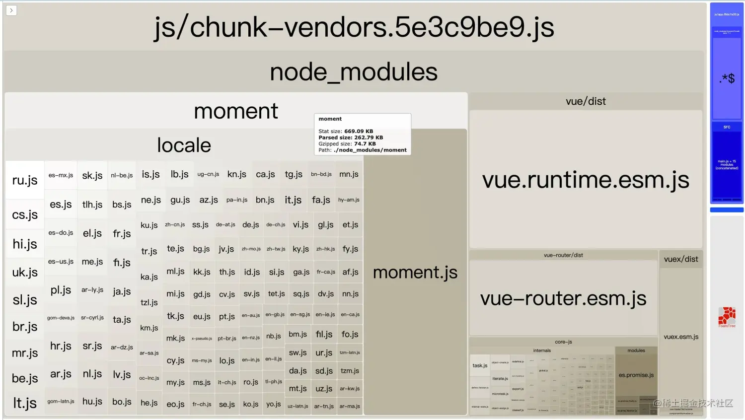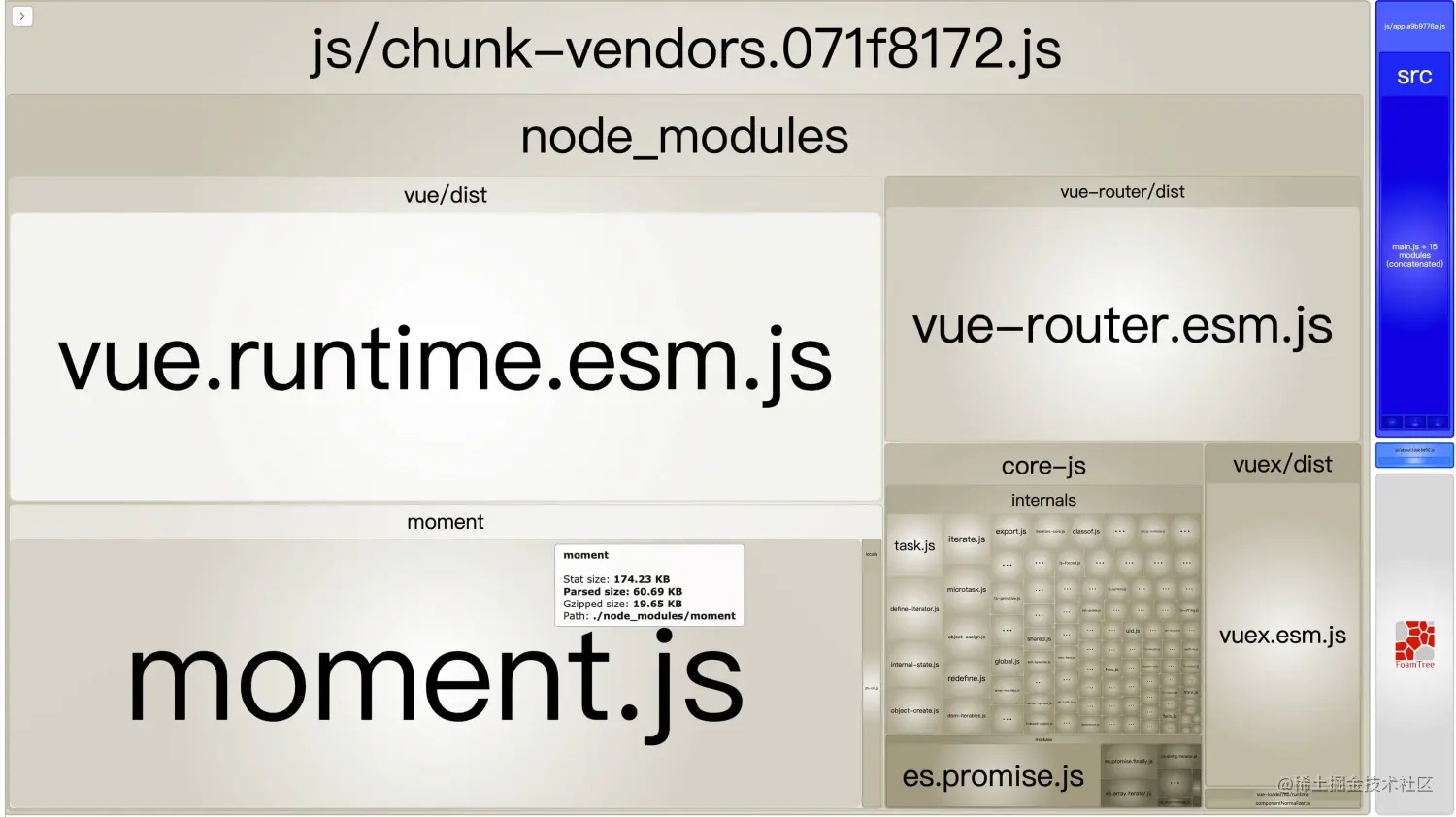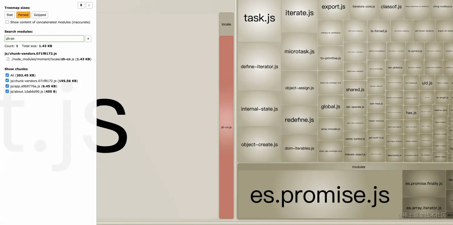 插件生成包分析视图,Vue CLI 默认配置中内置了该插件,可以通过在打包命令后追加 --report
