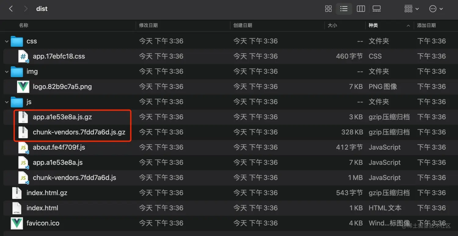 压缩效果如下,所有大于 1kb 的资源都生成了同名的 .gz