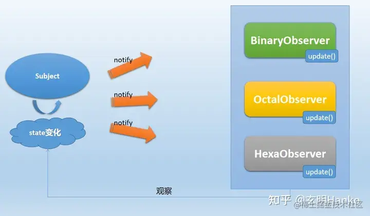 可以看到,当状态发生改变时,所有的观察者对象都会得到通知,并根据自己的实现进行更新操作。