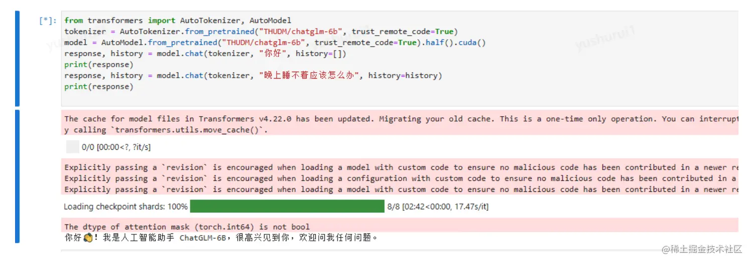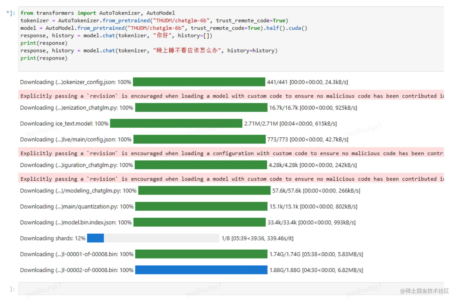 model = AutoModel.from_pretrained("THUDM/chatglm-6b", trust_remote_code=True).half().cuda()