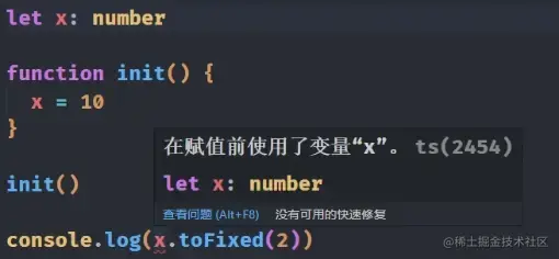 ●这是因为 TS 不太清楚你的 init 函数调用以后会对 x 进行赋值