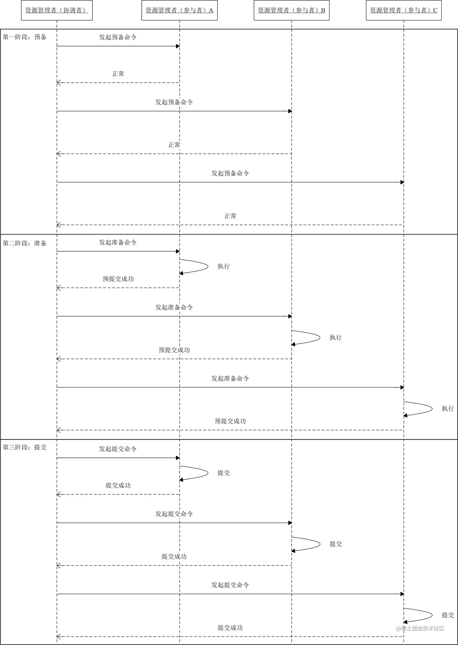 二阶段提交协议诸多问题,因此三阶段提交协议就要登上舞台了。三阶段提交协议是二阶段提交协议的改良版本,它与二阶段提交协议不同之处在于,引入了超时机制解决同步阻塞问题,此外加入了预备阶段尽可能提早发现无法执行的资源管理者(参与者)并且终止事务,如果全部资源管理者(参与者)都可以完成,才发起第二阶段的准备和第三阶段的提交。否则,其中任何一个资源管理者(参与者)回复执行失败或者超时等待,那么就终止事务。总结一下,三阶段提交协议包括:第一阶段预备,第二阶段准备,第二阶段提交。