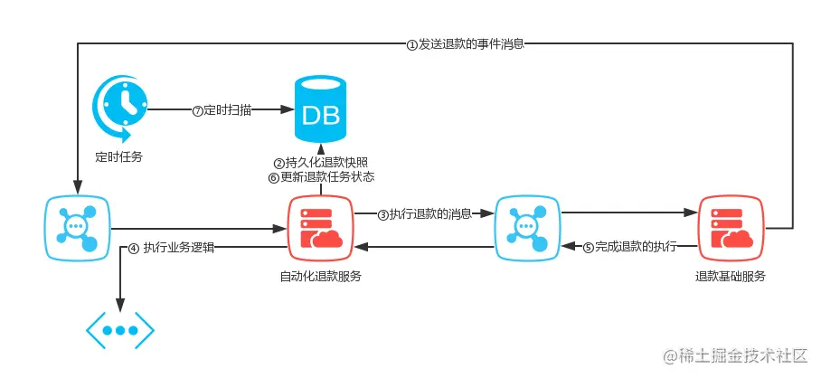 了解了“可靠事件模式”的方法论后,现在我们来看一个真实的案例来加深理解。首先,当用户发起退款后,自动化退款服务会收到一个退款的事件消息,此时,如果这笔退款符合自动化退款策略的话,自动化退款服务会先写入本地数据库持久化这笔退款快照,紧接着,发送一条执行退款的消息投递到给消息队列,消息队列接受到消息后返回响应成功结果,那么自动化退款服务就可以执行后续的业务逻辑。与此同时,消息队列异步地把消息投递给退款基础服务,然后退款基础服务执行自己业务相关的逻辑,执行失败与否由退款基础服务自我保证,如果执行成功则发送一条执行退款成功消息投递到给消息队列。最后,定时任务会从数据库扫描在一定时间内未完成的消息并重新投递。这里,需要注意的是,自动化退款服务持久化的退款快照可以理解为需要确保投递成功的消息,由“正反向消息机制”和“定时任务”确保其成功投递。此外,真正的退款出账逻辑在退款基础服务来保证,因此它要保证幂等性。当出现执行失败的状态并且超过重试次数时,就说明这个任务永久失败了,需要开发人员进行手工介入与排查问题。