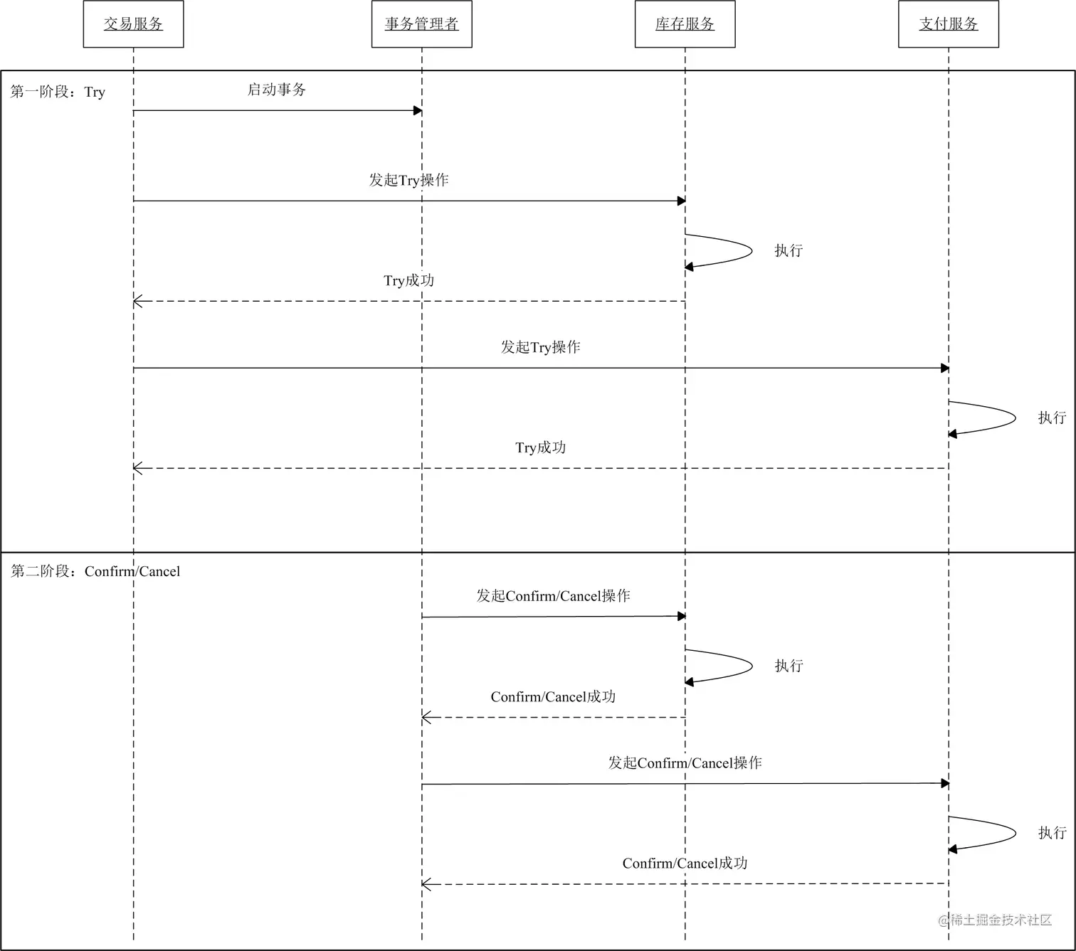 二阶段提交协议和三阶段提交协议很好的解决了分布式事务的问题,但是在极端情况下仍然存在数据的不一致性,此外它对系统的开销会比较大,引入事务管理者(协调者)后,比较容易出现单点瓶颈,以及在业务规模不断变大的情况下,系统可伸缩性也会存在问题。注意的是,它是同步操作,因此引入事务后,直到全局事务结束才能释放资源,性能可能是一个很大的问题。因此,在高并发场景下很少使用。因此,需要另外一种解决方案:TCC 模式。注意的是,很多读者把二阶段提交等同于二阶段提交协议,这个是一个误区,事实上,TCC 模式也是一种二阶段提交。