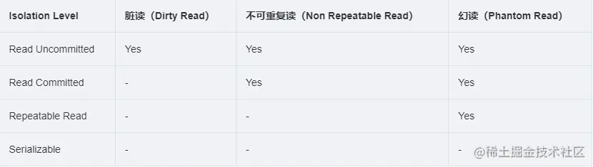(4)Serializable是最严格的隔离级别。在Serializable隔离级别下,所有事务按照次序依次执行,因此,脏读、不可重复读、幻读都不会出现。虽然Serializable隔离级别下的事务具有最高的安全性,但是,由于事务是串行执行,所以效率会大大下降,应用程序的性能会急剧降低。如果没有特别重要的情景,一般都不会使用Serializable隔离级别。