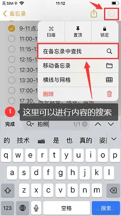 备忘录内容非常多,可以点击右上角的**【…】符号**,选择**【在备忘录中查找】**,快速搜索内容。