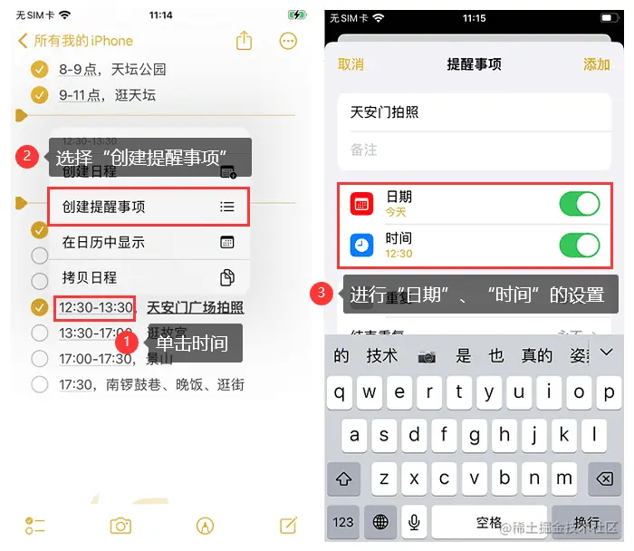 单击时间点,选择**【创建提醒事项】,还可以对日期、时间**进行调整。