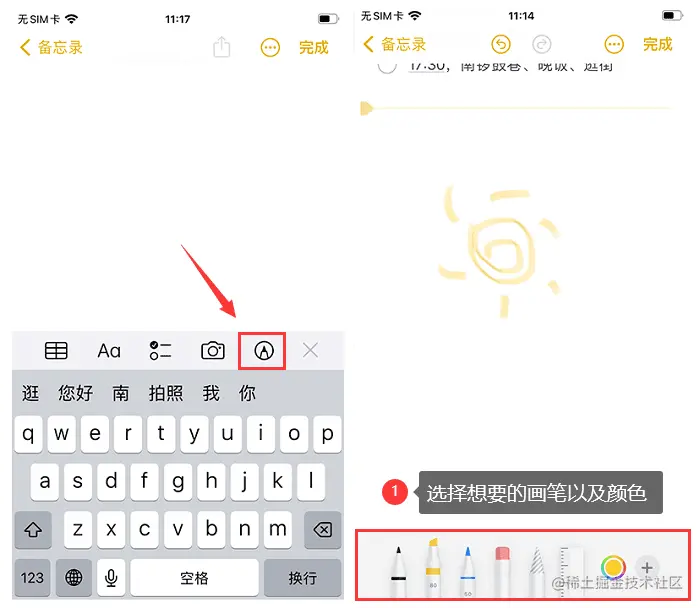 点击**【画笔按钮】**,选择要涂鸦的工具,在备忘录就可以随便涂鸦了。