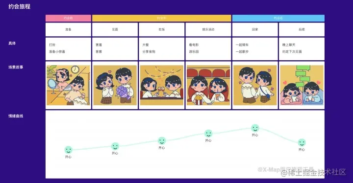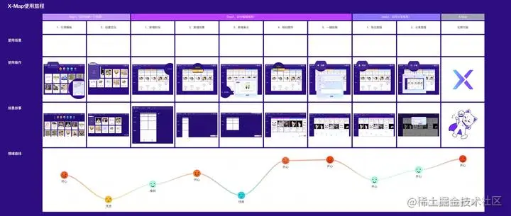 从用户旅程图的左侧可以看出,X-Map包含了用户旅程图的关键元素