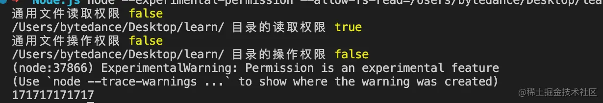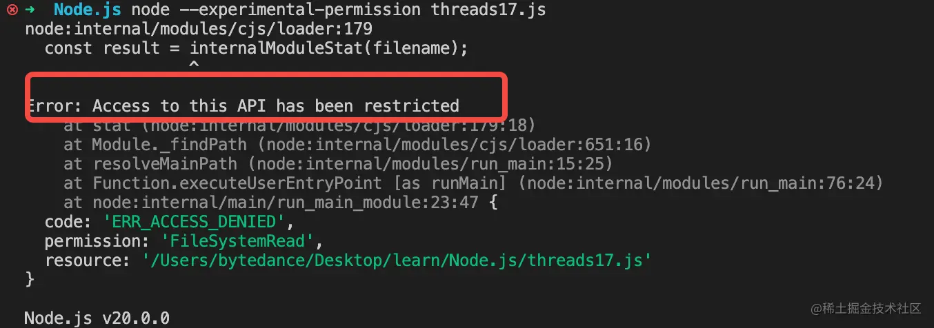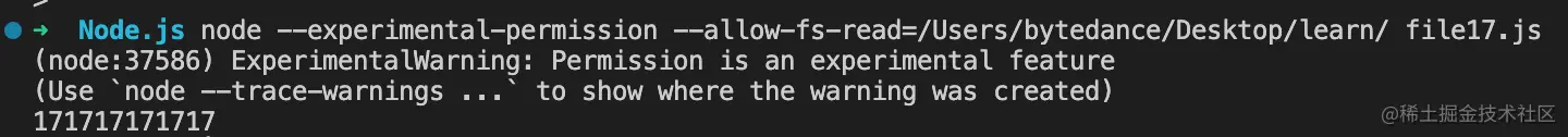 我们执行一下这个命令:node --experimental-permission --allow-fs-read=/Users/bytedance/Desktop/learn/ file17.js: