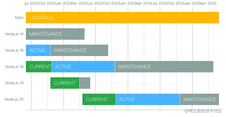 4月18号,Node.js 发布了 V20 版本,当前处于 Current 状态,预计会在今年 10 月份进入长期支持状态。