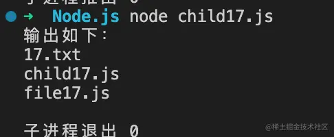 我们创建一个 child17.js 文件来测试执行一个简单的 ls 命令: