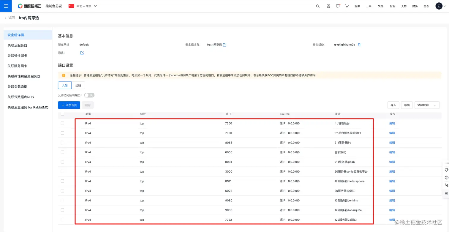 若公网服务器是在阿里云、百度云等云服务器上的,则需要在安全组中为frp开通指定的端口号,如:7000是frp服务默认端口号、7500是在frps.ini配置文件中指定的dashboard_port、其他的则是需要映射到内网服务器的端口