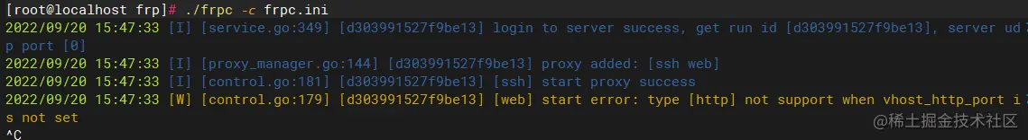 ./frpc -c frpc.ini # 启动客户端