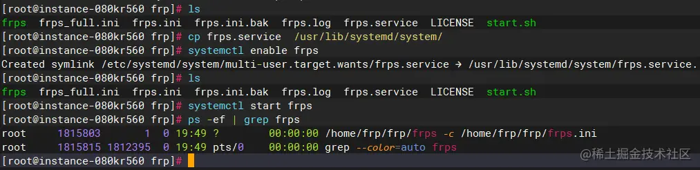 # 执行成功会提示“Created symlink /etc/systemd/system/multi-user.target.wants/frps.service → /usr/lib/systemd/system/frps.service.”
