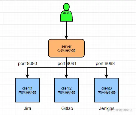 - 每个客户端都会有一个配置文件用于和服务器连接,不同的内网服务配置不同的端口号,例如内网服务器A上安装了jira服务,其端口是8080,内网服务器B上安装了Gitlab服务,其端口号是8081;