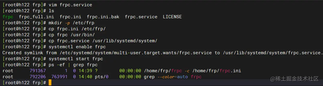 # 执行成功会提示“Created symlink from /etc/systemd/system/multi-user.target.wants/frpc.service to /usr/lib/systemd/system/frpc.service.”