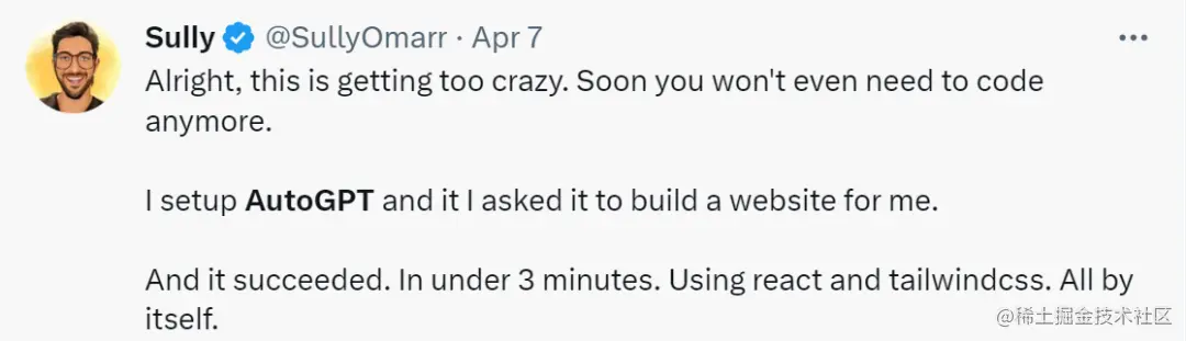 正如网友所说 AutoGPT 正在互联网上掀起一场风暴,它无处不在。很快,已经有网友上手实验了,该用户让 AutoGPT 建立一个网站,不到 3 分钟 AutoGPT 就成功了。 期间 AutoGPT 使用了 React 和 Tailwind CSS,全凭自己,人类没有插手。看来程序员之后真就不再需要编码了。