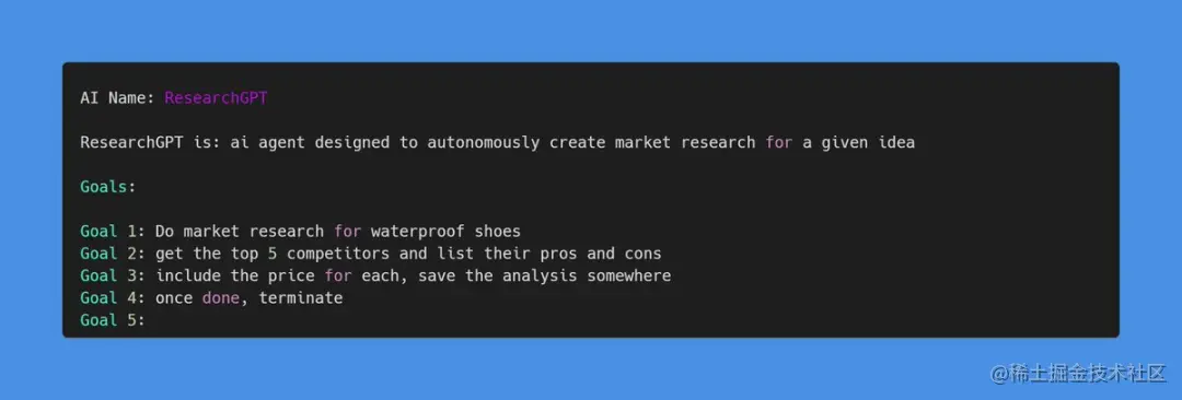 接下里我们再看一个例子。假装自己经营一家鞋公司,给 AutoGPT 下达的命令是对防水鞋进行市场调查,然后让其给出Top5 公司,并报告竞争对手的优缺点 :