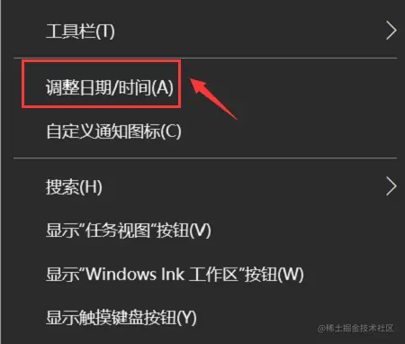 - 在Windows任务栏上找到日期和时间,右键点击并选择 【调整日期/时间】 ;
