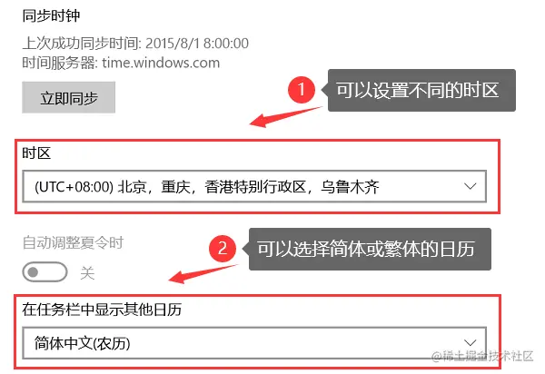 - 找到 【时区】 和 【在任务栏中显示其他日历】 进行设置即可。