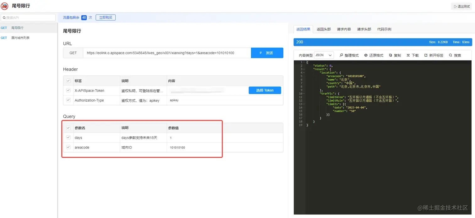 我们依旧点击尾号限行API 详情页的【免费试用】按钮,马上就能进入测试界面。按照界面要求输入你想要了解的城市编码以及未来 N 天的数据,点击发送就能获取该城市的限行规则了。