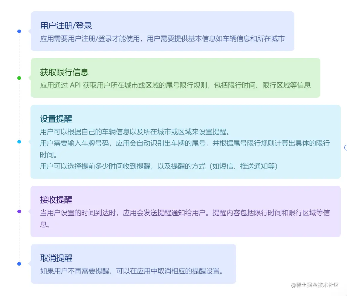 实现方法是使用该 API 获取用户所在城市或区域的尾号限行规则,然后根据用户车辆的尾号信息,计算出具体的限行时间,并设置提醒功能。