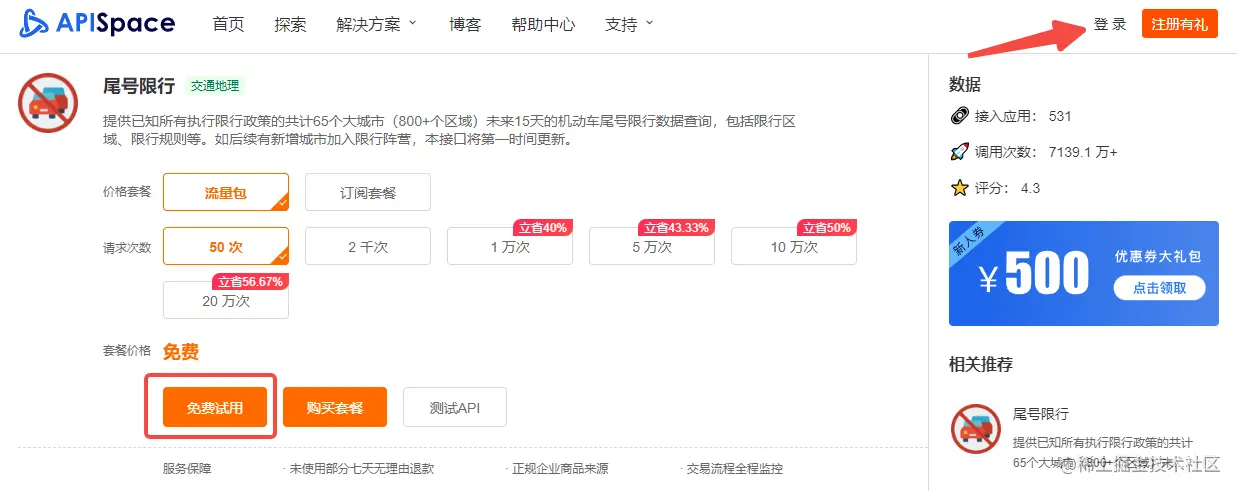 我们直接访问尾号限行API 详情页, 选择【免费试用】或者 【登录】、【注册有礼】都可以注册一个 API 账号。