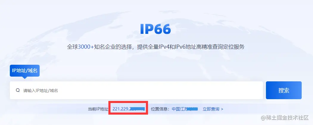 注意:这里指的是公网的IP地址,而不是局域网的IP地址,之前因为我是在学校,所以获取的本机IP是经过校园再分配的地址,不是公网的IP地址,导致定位失败。所以我们需要用到IP地址查询,进入这个页面【www.ip66.net/?utm-source… 】就会展示出你使用的公网IP地址是多少啦。