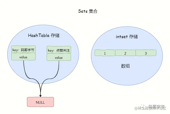 不同的是,当元素内容都是 64 位以内的十进制整数的时候,并且元素个数不超过 set-max-intset-entries 配置的值(默认 512)的时候,会使用更加省内存的 intset(整形数组)来存储。