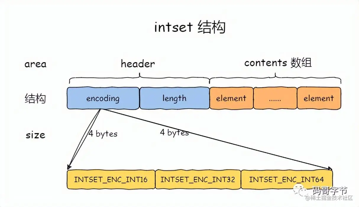 - INTSET_ENC_INT32,表示 contents 数组的存储元素是 int32_t 类型,每 4 字节表示一个元素。