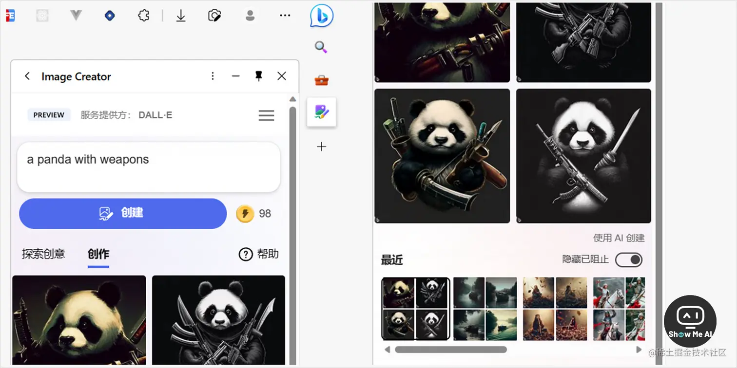 第二种硬核玩法,是在New Bing 创造力模式里,可以无限次、免费地使用AI进行画图(fast模式限额100次 )。出图质量不错,而且方便易用,广场上还有很多例子可以看。