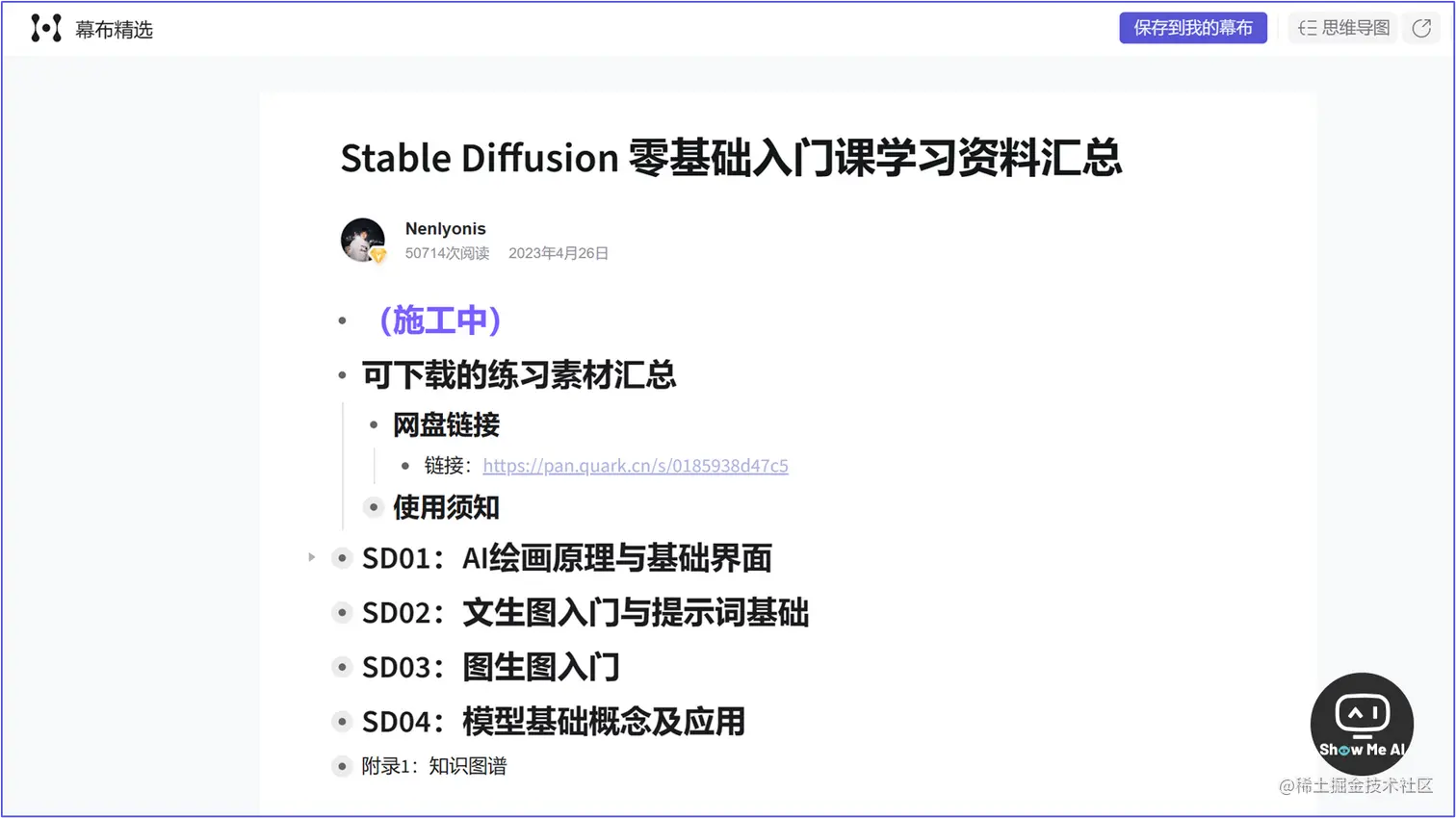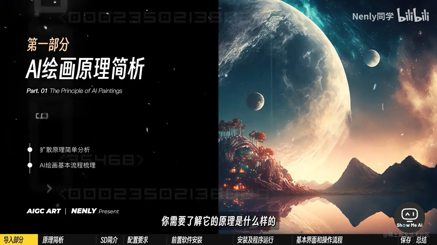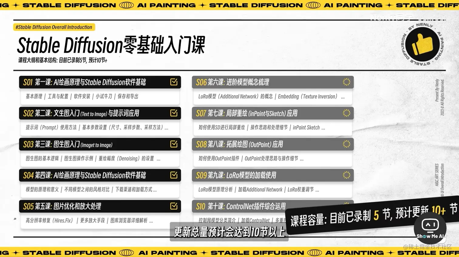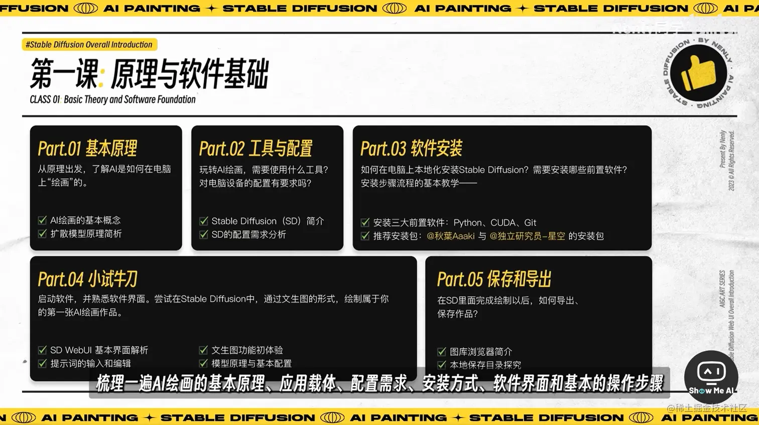 在已经更新的第一节课里,作者用20分钟讲清了 AI 绘画的基本原理、SD安装与界面操作等内容,真正做到了零基础也能带你入门。