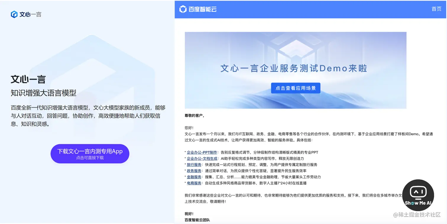 4月25日,从百度发给客户的邮件中获悉,百度已经启动文心一言企业服务的内测。从曝光的Demo来看,文心一言企业服务未来将率先覆盖企业办公、旅游服务、电商服务、政务服务、金融服务等场景,可实现PPT制作、文档生成、旅游行程规划、电商带货脚本生成、数字人直播、金融信息检索及投资建议书生成等。