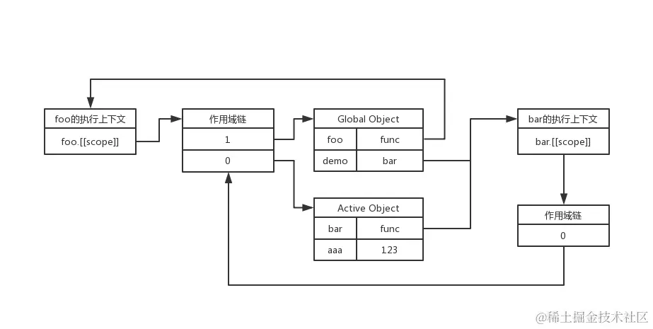 2.foo函数执行,作用域的第一位,改为foo函数的局部执行上下文,第二位则是之前的全局执行上下文。在foo函数执行的同时,我们迎来了bar函数的定义。形成了bar函数的作用域链(当访问一个变量时,解释器会首先在当前作用域中查找标识符,如果没找到,就去父作用域找,直到找到该变量的标识符或没找到为止。这条寻找的链路就叫作用域链),由于bar在函数foo内被定义,它可以访问foo的作用域,使以bar的作用域链上天生就有foo的作用域链,所以下面我将bar的作用域链指向foo的作用域链。同时bar函数被return赋值给了demo这个全局变量。