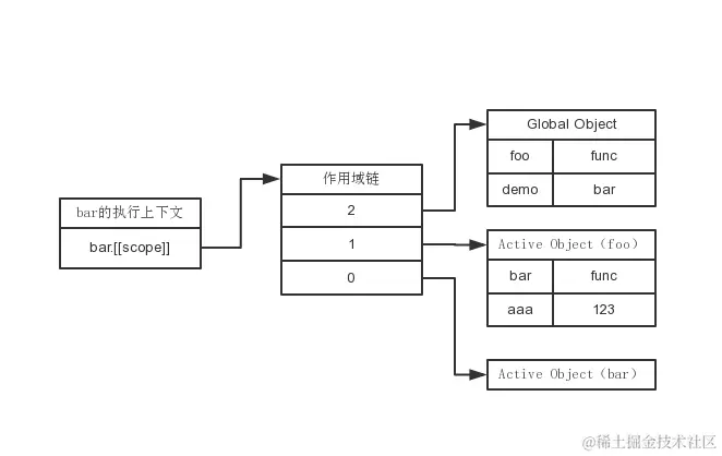 3.bar函数执行,bar函数作用域链第一位改为自身局部执行上下文,执行 console.log(aaa) 按照作用域链查找,输出123