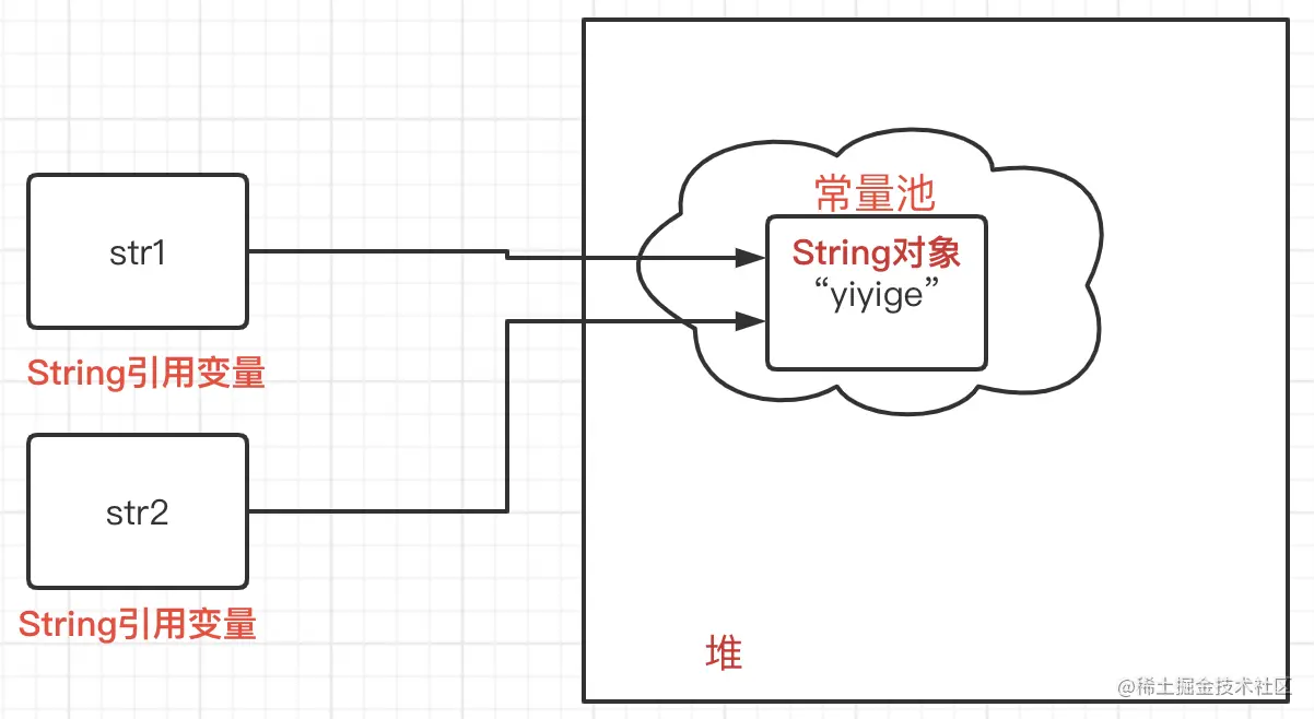 Java专门为String类设计了一个缓存池intern pool,intern pool是在方法区中的一块特殊存储区域,当我们通过 String str="yiyige" 这样的方式来构造一个新的字符串时,String类会优先在缓存池中查找是否已经存在内容相同的String对象。
