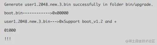 - 编译成功后系统显示生成的 BIN 文件及其下载到 Flash 中的地址,如下图所示。