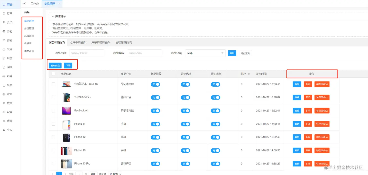 管理全部商品,包括在售,仓库,库存预警,回收站的商品,分类管理所有多极分类的图标,管理全部商品品牌,查看管理现有供货商和查看所有购买店铺商品的用户作出的评价