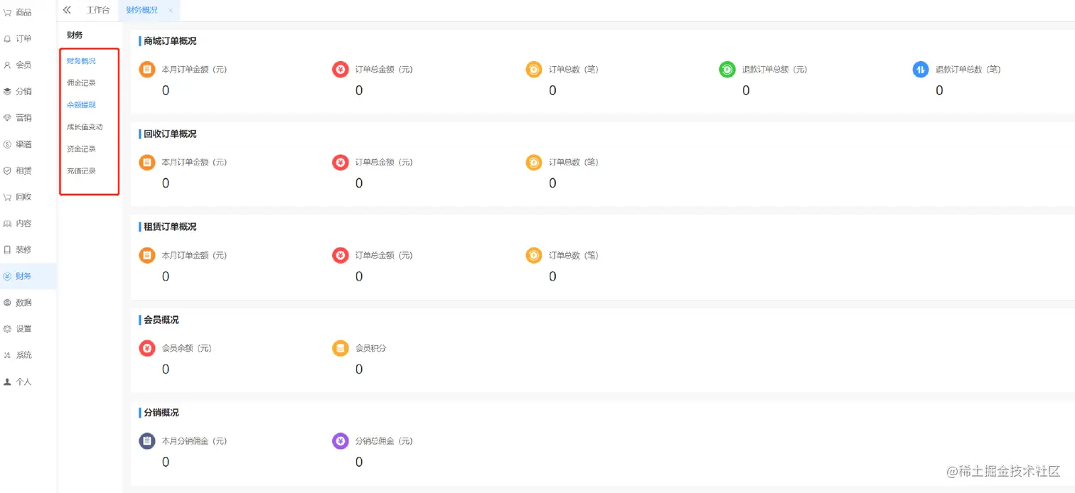 财务概况、佣金记录、余额提现、成长值变动、资金记录、充值记录