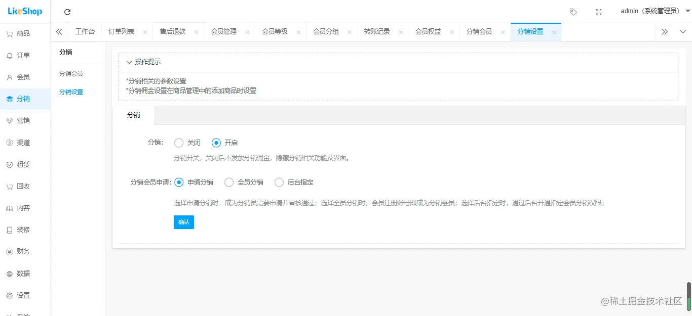 可以查看分销员佣金详情,直推会员,分销的订单,以及修改分销员上级,开启及会员分销申请状态设置