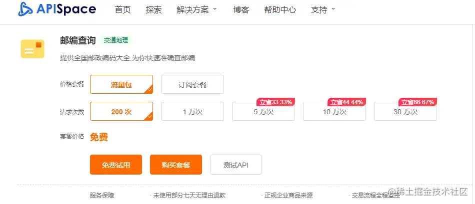 进入 【邮编查询】详情页,点击【免费试用】,即可唤起注册按钮。