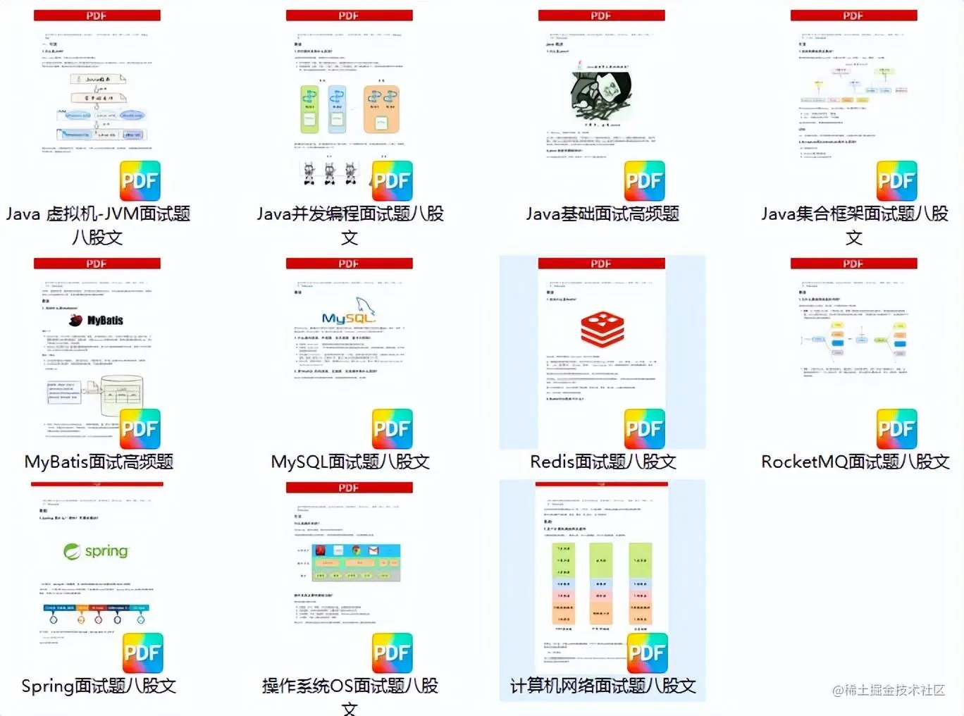 八股文一共有11份,分别是Java基础,Java集合,JVM,Java并发,mysql,mybatis,Redis,MQ,Spring,OS,计算机网络,由于篇幅限制就只展示部分,