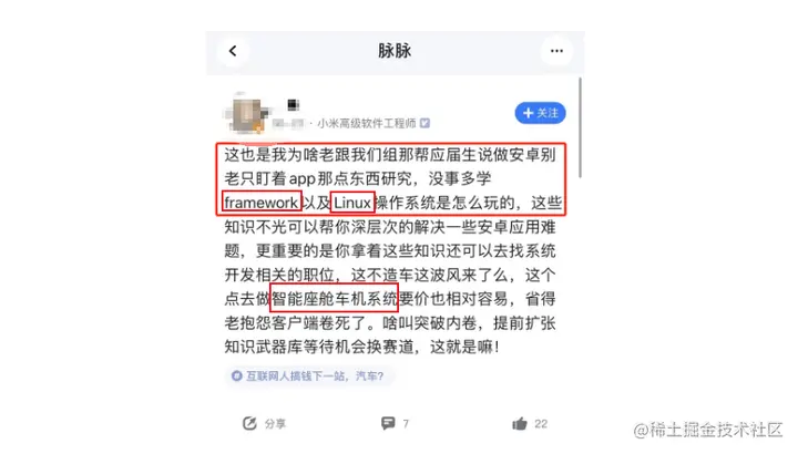 近年来,客户端领域的竞争日益激烈,很多安卓开发者抱怨内卷现象普遍存在。在这种背景下,开发者们面对的压力越来越大,很难掌握足够的技能去顺利发展。解决内卷,突破迷茫,是许多开发者面临的挑战。小米的高管在脉脉上提供了一条不错的建议,即如下: