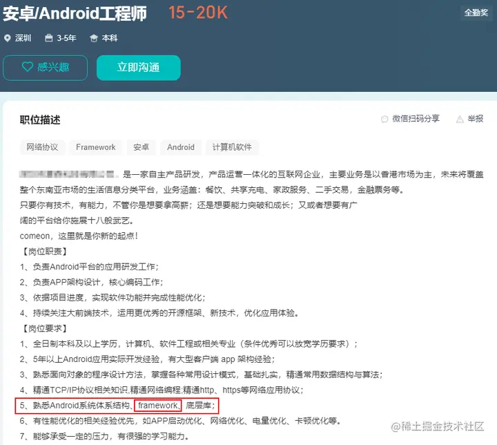 而在卷王的时代再看看Android高级开发工程师的应聘条件可以看出,framework也纳入其中。