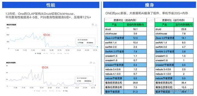 4. 从性能看,拿公有云统计性能数据,基于Clickhouse的OneData底座P99查询性能比历史Druid架构提高了6倍以上,平均耗时从秒级降到了毫秒级。同时在晚回数据场景,稳定性和效率比Druid体现的更加优秀,维护成本为0。