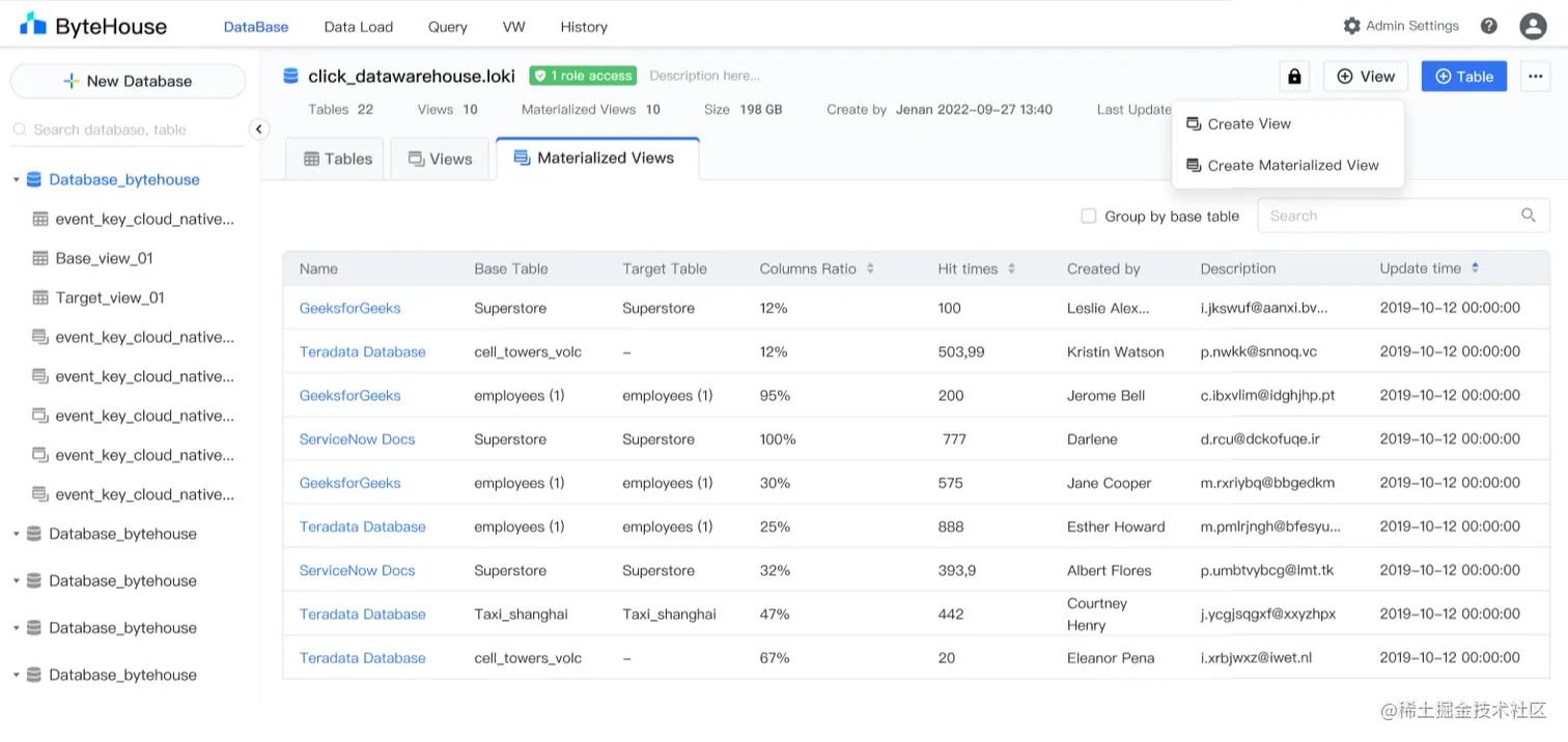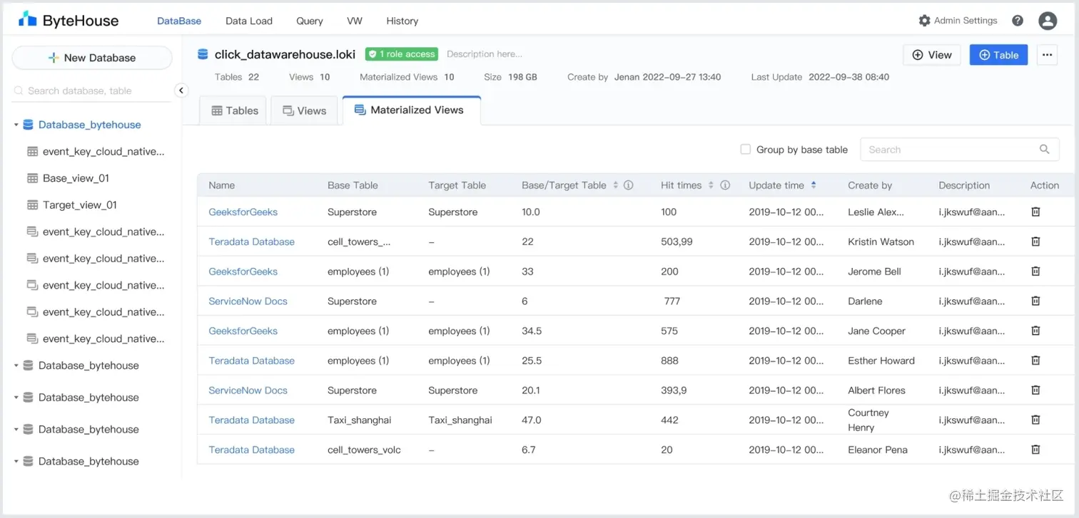 Bytehouse 会列出数据库中的所有物化视图,以及它们的底表/目标表行数比例,以及命中率。