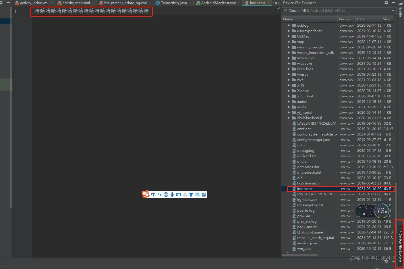 这就是我们刚才写入的imooc.txt 文件,这儿需要足以的是在Android 6.0 以后不但需要在AndroidManifest 中配置权限,还需要动态获取读写权限 在AndroidManifest.xml 文件中配置权限