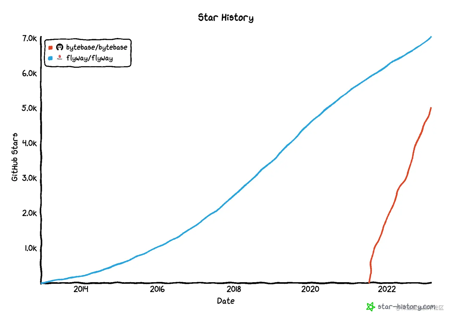 Flyway 和 Bytebase 都是开源项目,Flyway 作为老牌工具在 GitHub 上积累了更多的星星,而 Bytebase 的增长很快。