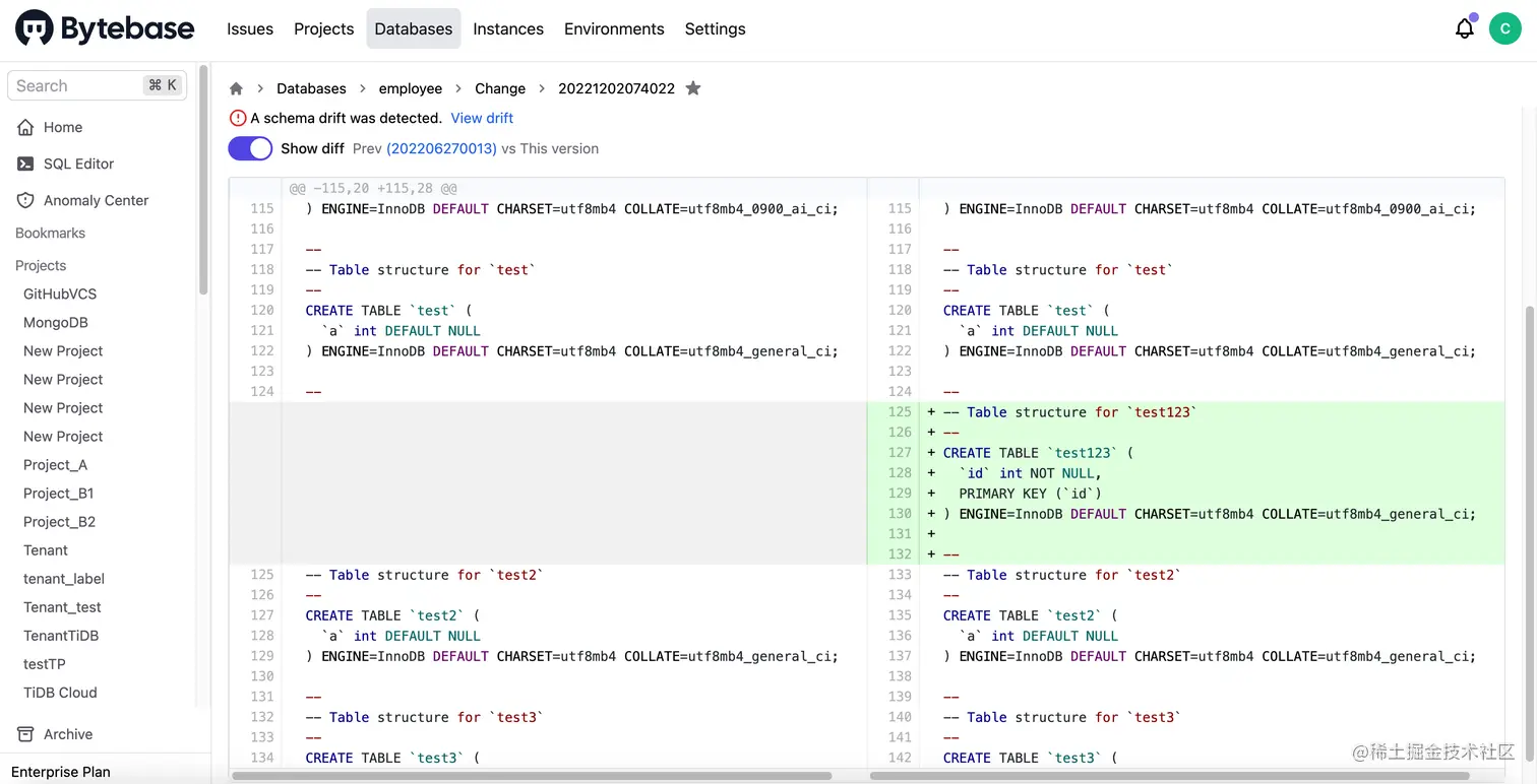 下钻后清晰的可视化展示差异对比,同时可以查看变更后的完整表结构。